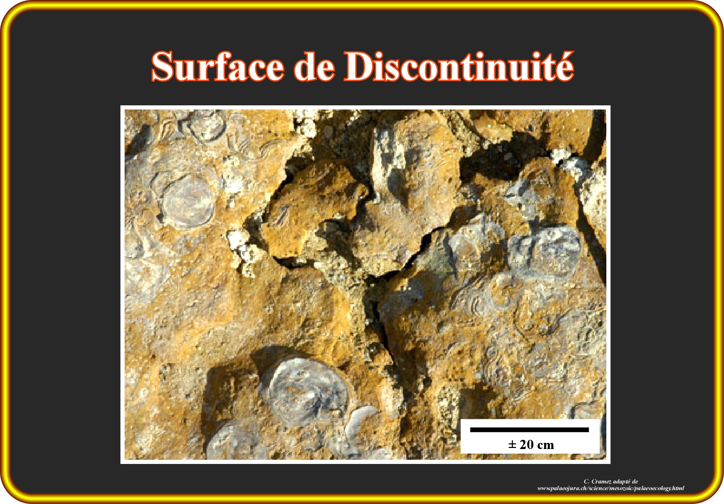Une fois que les surfaces de discontinuité présentent très peu ou aucune érosion, elles ne peuvent pas être des limites des cycles stratigraphiques, particulièrement, des cycles stratigraphiques dits cycles-séquences. Ceci veut dire, qu'elles ne peuvent être considérées comme discordances, une fois qu'elles ne sont pas induites par des chutes relatives du niveau de la mer significatives, qui ont mis le niveau de la mer plus bas que le rebord du bassin. En général, ces surfaces sont contemporaines de la sédimentation, comme, par exemple, celles qui se forment entre le cortège transgressif et le prisme de haut niveau. Cependant, elles peuvent, aussi, être postérieures au dépôt, comme, par exemple, les disharmonies tectoniques induites par l'écoulement latéral ou vertical d'un intervalle salifère. Au point de vu sédimentaire, les plus intéressantes, sont les surfaces de discontinuité contemporaines de la sédimentation, une fois qu'elles caractérisent un hiatus de non-dépôt important ou une section stratigraphique, qui traduit un taux de sédimentation très faible. De manière général, toute surface de discontinuité, comme, par exemple, les surfaces indurées ou les plans de stratification avec fossiles (dinosaures, par exemple) ou fractures de dessiccation sont des surfaces d'omission, comme illustré dans cette figure. C'est pour cela que les roches-mères potentielles marines, autrement dit, les roches marines riches en matière organique, sont, presque toujours, associées comme surfaces de ce type. Dans les plates-formes carbonatées, de telles surfaces marquent la transition entre les lithologies d'eau peu profonde vers très profonde. Elles soulignent des réactions du système sédimentaire aux rapides et drastiques changements environnementales er enregistrent les intervalles de temps plus importantes de l'évolution des plate-formes. En fait, dans les plate-formes carbonatées peu profondes, l'enregistrement sédimentaire représente, uniquement, une petite parte du temps géologique et beaucoup des intervalles sédimentaires ne se déposent pas ou se trouvent uniquement sous la forme d'intervalles re-travaillés. Tout ceci veut dire qu'il est très difficile d'évaluer l'intervalle de temps associé à une surface de discontinuité ou d'omission. En fait, il peut varier entre quelques jours et des millions d'années.