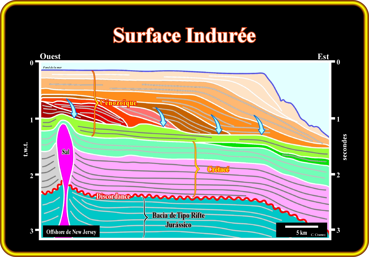 Sur les données sismique, presque toutes les surfaces indurées sont sous la résolution sismique. Cependant, les terminaisons de réflecteurs et surtout la configuration interne des différents paquets sédimentaires permet, par fois, pronostiquer la présence de telles surfaces. En fait, elles sont, presque toujours, associées avec les surfaces de base des progradations, comme est, probablement, le cas dans cette tentative d'interprétation géologique d'une ligne sismique du canyon de Baltimore )offshore des EUA). Dans cette tentative, l'interface entre les sédiments avec géométrie aggradante et progradante correspond à la surface de base des progradations de la phase régressive du cycle stratigraphique d'empiétement continental post-Pangée, lequel a été induit par un cycle eustatique de 1er ordre, autrement dit, un cycle eustatique avec une durée supérieure à 50 My. Ainsi, cette surface marque un hiatus de non-dépôt important, lequel, naturellement, augmente vers la partie profonde du bassin et correspond, certainement, à une surface endurée. En fait, dans ce cas particulier, le cycle stratigraphique d'empiétement continental correspond à la marge continentale divergente Méso-Cénozoïque, qui a fossilisé les bassins de type rift, dans lesquels se sont déposés des horizons salifères et, que dans cette région, sont d'âge Jurassique. Notons que dans cette tentative d'interprétation, uniquement, la discordance associée à la rupture de la Pangée est soulignée par un trait ondulé. Dû à une forte et rapide lithification et aux caractéristiques lithologiques, les surfaces endurées, par fois, créent des interfaces avec des impédances acoustiques très contrastées, ce qui peut causer des réflexions sismiques avec des fortes amplitudes. Dans le golfe de Mexique, par exemple, beaucoup d'anomalies d'amplitude, qui ont été initialement interprétées comme la conséquence de la présence d'hydrocarbures en roches-réservoirs de bonne qualité, ont été, plus tard, interprétées, après les résultats des puits d'exploration pétrolière, comme des surfaces endurées.