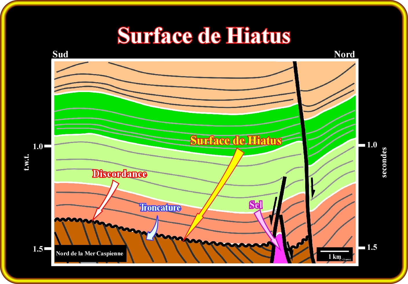Surface qui souligne un temps géologique qui n'est pas par des sédiments. Existent plusieurs surfaces d'hiatus. Les principales sont : (i) Discordances ; (ii) Surfaces de base des progradations et (iii) Plans de stratification, etc.