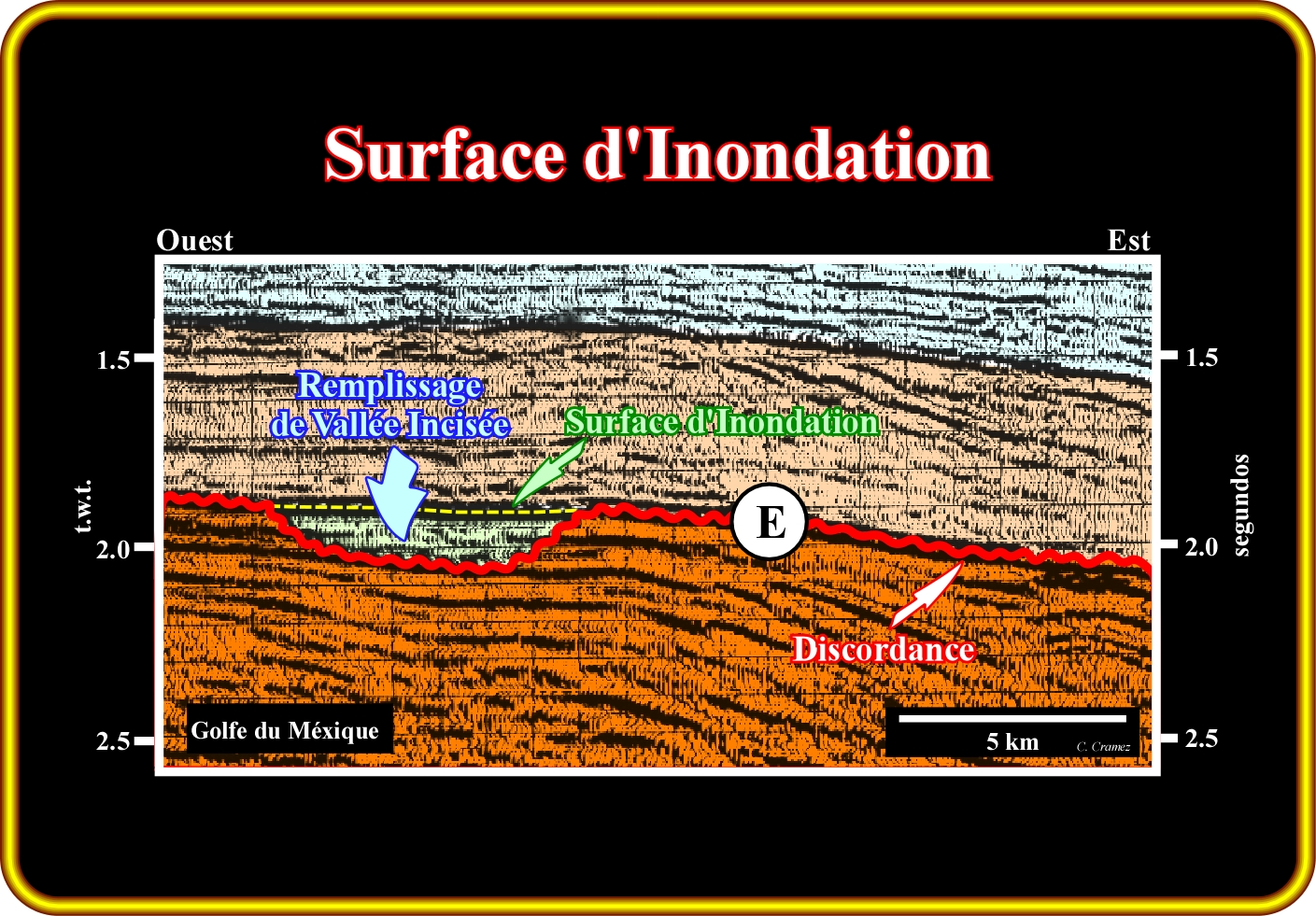 Dans un cycle stratigraphique dit cycle-séquence (induit par un cycle eustatique de 3e ordre, autrement dit, avec une duré variant entre 0.5 My et 3-5 My), la limite entre le prisme de bas niveau (ou des remplissages des vallées incisées associées) et le cortège transgressif est marquée par la première surface d'inondation. Ceci veut dire, que les surfaces transgressives sont, surtout, fréquentes dans les cortèges sédimentaires de haut niveau, dans lesquels le niveau de la mer est plus haut que le rebord du bassin. Dans cette tentative d'interprétation géologique d'un détail d'une ligne sismique du Golfe du Mexique, la discordance (E), qui sépare deux cycles-séquence, est facilement reconnue par les biseaux de troncature crées par les chutes relatives du niveau de la mer (érosion), qui a formé une vallée incisée. Cette chute relative du niveau de la mer, a déplacé vers le bassin, et vers le bas, les biseaux d'aggradation, ce qui a exhumé la plaine côtière du prisme de haut niveau du cycle-séquence sous-jacent, en même temps que des vallées incisées se forment dans la plaine côtière. Durant cette chute relative du niveau de la mer, la partie la plus profonde du bassin, autrement dit, en aval du rebord du bassin (rupture d'inclinaison de la discordance), se sont déposé, certainement, des cônes sous-marins de bassin et talus, lesquels ne sont pas visibles dans ce détail. Dès que le niveau relatif de la mer a commencé a monter, en aval du rebord du bassin (marqué par la rupture d'inclinaison de la discordance E), s'est déposé un prisme de bas niveau. Les vallées incisées ont été remplis, en des conditions géologiques de bas niveau, durant le dépôt de la partie supérieure (terminale) du prisme de bas niveau. Quand le niveau relatif de la mer a atteint le rebord du bassin, la plaine côtière (marquée surtout par le sédiments do cycle-séquence sous-jacent) et les remplissages des vallées incisées ont été fossilisées par la 1er surface d'inondation. Pendant le dépôt du cortège transgressif, à chaque incrément de montée relative du niveau de la mer (en accélération) s'est formé une surface d'inondation qui est fossilisée par le dépôt de paracycles-séquences, dont les dimensions, chaque fois plus petites, créent une géométrie rétrogradante.