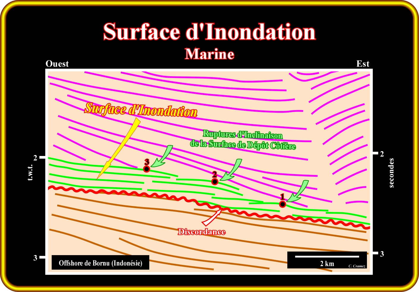 L'expression surface d'inondation marine semble redondante, mais, dans la réalité elle ne l'est pas, une fois qui existent surfaces d'inondation dans de environnements fluviaux, en particulier, en association avec les dépôts de débordement. On peut dire, par exemple, que le long d'une vallée fluviale, il y a une surface d'inondation marine entre chaque digue marginale naturelle. Dans cette tentative d'interprétation géologique d'une ligne sismique de l'île de Bornéu (Indonésie), plusieurs surfaces d'inondation marines se reconnaissent dans le cortège transgressif (lignes chronostratigraphiques en blanc) d'un cycle-séquence. Ce cortège transgressif, qui a fossilisé la discordance entre deux cycles stratigraphiques (probablement des cycles-séquences), est caractérisé par une géométrie rétrogradante (l'épaisseur du cortège transgressif augment en direction du continent, pour après disparaître, rapidement, par biseautage). Cette géométrie est déterminée par les montées relatives du niveau de la mer successives (sans chutes relatives entre elles, paracycles-séquences), qui, globalement, déplacent vers le continent les successives ruptures d'inclinaison de la surface de déposition côtières (plus au moins la ligne de côte). Ce déplacement vers l'amont de la ligne de côte, a comme conséquence principale la formation d'une plate-forme continentale durant la première surface d'inondation et, après, l'augmentation de celle-ci à chaque incrément. En fait, a chaque incrément de la montée relative du niveau de la mer /en accélération), la ligne de côte peut se déplacer des dizaine de kilomètres vers le continent, ce qui augmente l'espace disponible vers les sédiments dans la plat-forme récemment formée. Par la suite, se suit une période de stabilité du niveau relatif de la mer, durant laquelle la ligne de côte se déplace, progressivement, vers la mer, au fur et à mesure que les sédiments se déposent, mais sans atteindre la position qu'elle avez avant le dernier incrément.