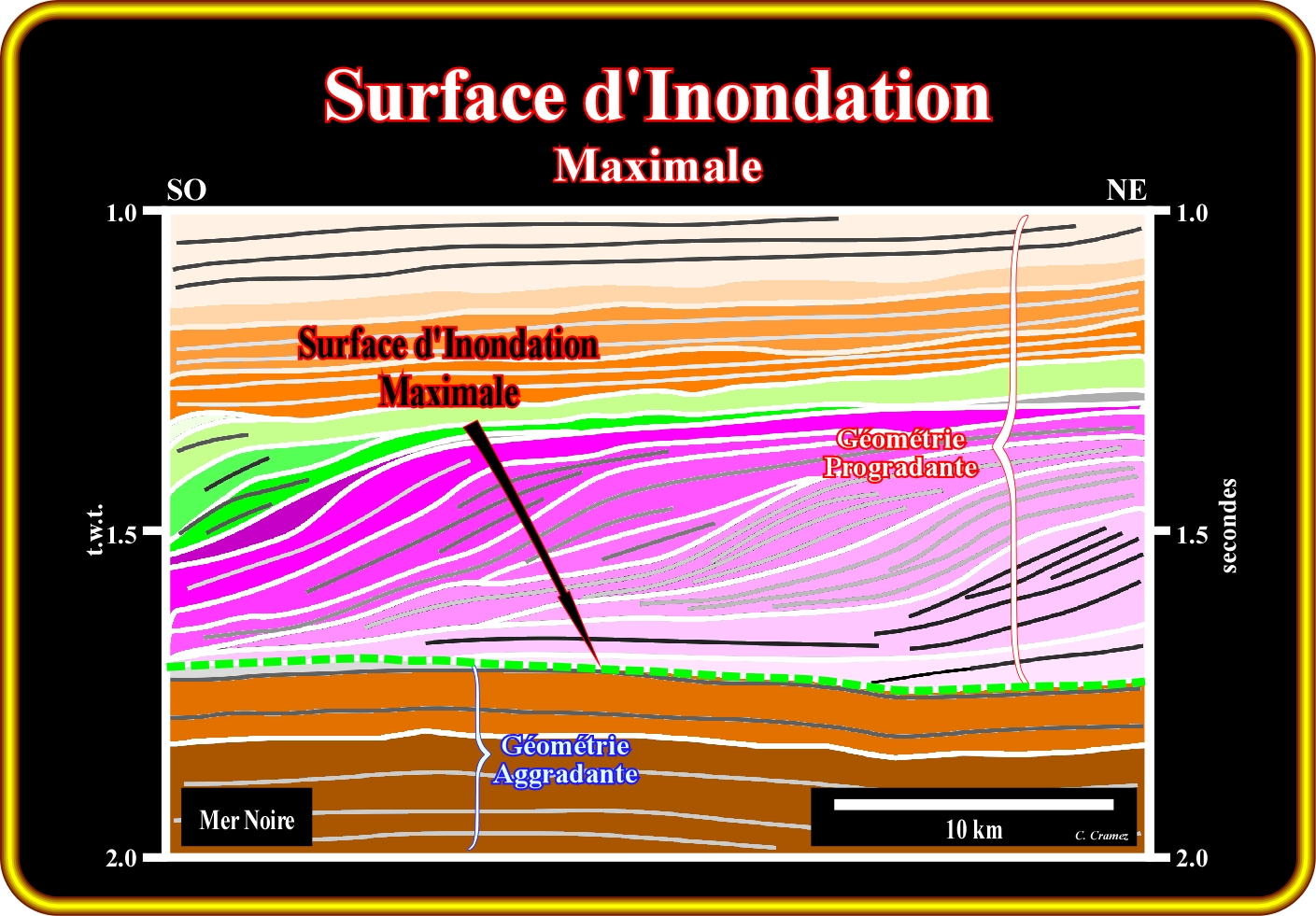 Quand on parle d'une surface d'inondation maximale on doit préciser quel est le cycle stratigraphique ou eustatique considéré. En fait, par définition, à l'intérieur de chaque cycle eustatique, qu'il soit de 1er, 2e, 3e ou 4e ordre, il y a toujours une surface d'inondation maximale. Dan un cycle stratigraphique dit cycle-séquence, qui est induit par un cycle eustatique de 3e ordre (durée entre 0.5 et 3-5 My), la surface d'inondation maximale correspond à la limite entre le cortège transgressif (montée relative du niveau de la mer en accélération) et le prisme de haut niveau (montée relative du niveau de la mer en décélération). Dans un cycle stratigraphique d'empiétement continental, lequel est induit par un cycle eustatique de 1er ordre (durée supérieur à 50 My), la surface d'inondation maximale correspond à l'interface entre la phase transgressive (montée eustatique) et régressive (chute eustatique). Dans cette tentative d'interprétation géologique d'une ligne sismique de la Mer Noire, le contraste entre la phase transgressive et régressive do cycle d'empiétement continental post-Pangée est souligné par la géométrie aggradante de la première et progradante de la deuxième. L'interface entre ces deux phases est la surface d'inondation maximale du cycle d'empiétement continental. Notons que la plupart des progradations de la phase régressive sont sigmoïdales. Les segments de la base de ces progradations sigmoïdales ont tendance à disparaître contre la surface d'inondation maximale. Les terminaisons distales des réflecteurs sont des biseaux de progradation, soit apparents, soit réels, ce qui veut dire que, par fois, l'espace entre deux réflexions consécutives est sous la résolution sismique. Ces configurations impliquent un apport sédimentaire, relativement, faible ou une rapide montée relative du niveau de la mer, ce qui permet le dépôt et la préservation des segments supérieurs. Les roches-mères marine potentielles, plus probables, sont associées avec la surface d'inondation maximale.