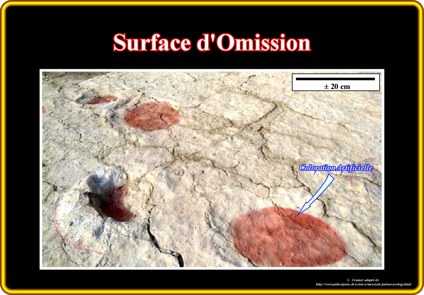 L'expression surface d'omission a été utilisée par la première fois par le géoscientiste suisse Albert Heim pour désigner les surfaces de discontinuité qui soulignent un arrêt temporaire de la déposition sans qu'aucune ou très peu d'érosion ait eu lieu. Dans un sens plus large, n'importe quelle surface de discontinuité, comme les surfaces indurées ou les plans de stratification avec traces de dinosaures (comme illustré dans cette figure) ou avec des fentes de dessiccation sont des surfaces d'omission. Dans les plate-formes carbonatées, ces surfaces marquent la transition entre des lithologies avec des profondeurs d'eau très différentes. À grande échelle et, en particulier, à l'échelle des ligne sismiques, les surfaces d'omission correspondent, presque toujours, aux surfaces de base des progradations, le long desquelles les intervalles sédimentaires sont condensés et, très souvent, riches en matière organique (roches-mères potentielles). En fait, ces surfaces se forment entre des sédiments avec une géométrie rétrogradante et progradante. Durant le dépôt des sédiments rétrogradants les montées relatives du niveau de la mer (sans chutes relatives entre elles), déplacent vers le continent la ligne de côte et les dépôts côtiers. Ce déplacement, vers l'amont de la rupture d'inclinaison de la surface de déposition côtière, augmente l'extension de la plate-forme continentale, diminue, relativement, l'apport terrigène et crée, dans les parties distales de la plate-forme, des conditions de sous-alimentation (taux de déposition très faible). Dès que le niveaux de la mer commence à monter, mais en accélération (comme, par exemple, 15 mètres, 10 m, 7 m, 5 m, 2 m, 0 mètre) et jusqu'à commencer à descendre rapidement (discordance), les sédiments commencent à prograder en direction de la mer, diminuant, progressivement, l'extension de la plate-forme continentale, et fossilisent, peu à peu, la surface d'omission du sommet de la section condensée déposée pendant l'épisode transgressif (en général, le cortège transgressif d'un cycle-séquence).