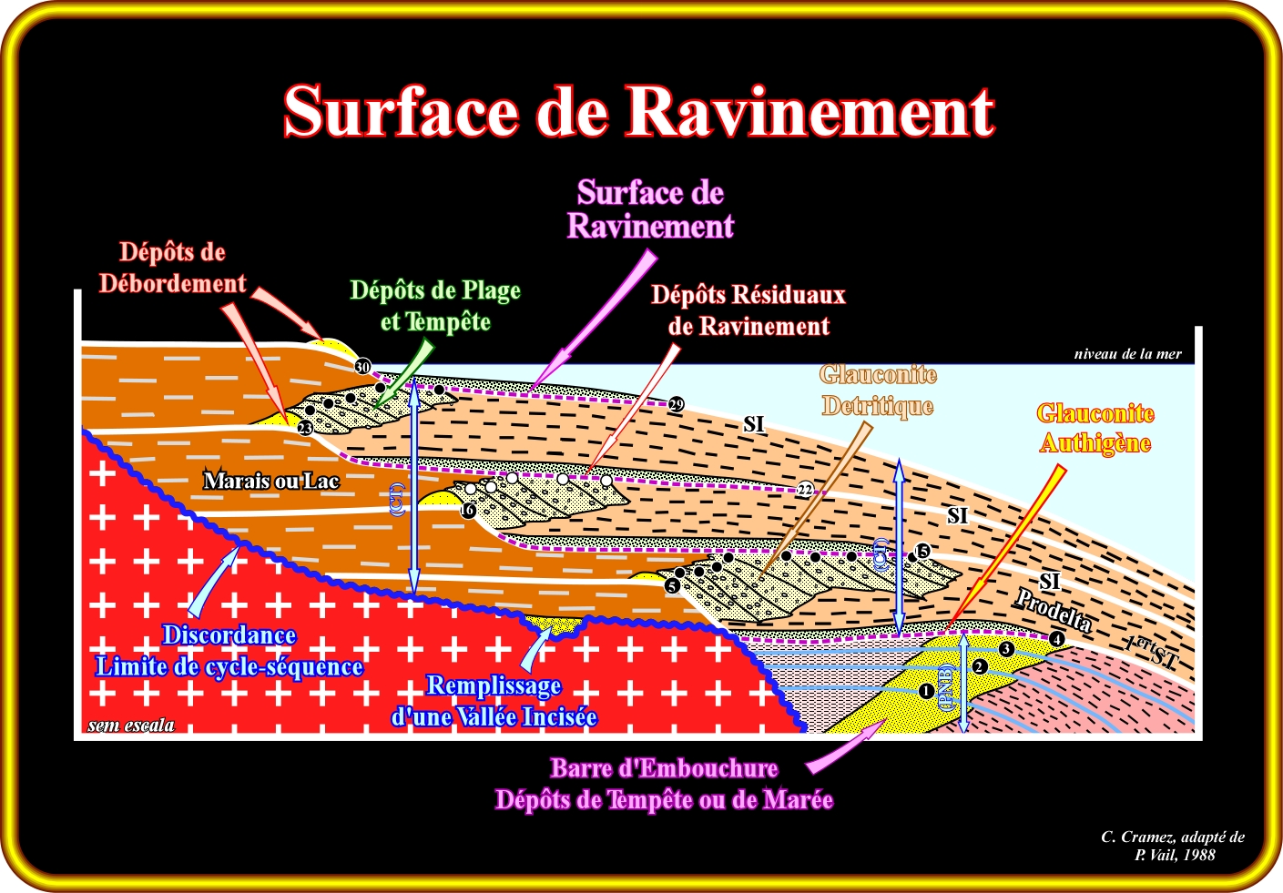 Comme illustré, une surface de ravinement est, normalement, associée au mouvement rétrogradant (ou transgressif) de la ligne de côte. Un tel mouvement a lieu, presque toujours, pendant le cortège transgressif d'un cycle stratigraphique dit cycle-séquence. Cependant, ce mouvement rétrogradant alterne avec le déplacement de la ligne de côte et des sédiments côtiers vers la mer sans aggradation négative. Ceci veut dire, qu'il n'y a pas des chutes relatives du niveau de la mer entre chaque montée relative (incréments ou paracycles eustatiques). En d'autres mots, on peut dire qu'une transgression est une succession de régressions chaque fois plus petites, une fois qu'à chaque paracycle eustatique l'extension de la plate-forme continentale de la tranche d'eau augmentent. Les surfaces de ravinement sont des surfaces d'érosion induites par l'action des vagues qui se forment quand l'eau avance sur une surface sédimentaire sous-jacente. Ainsi, si la partie supérieure d'un prisme de bas niveau a une zone subaérienne, certainement, il aura une surface de ravinement associé dès que le niveau de la mer relative monte. Dans les affleurements et puits d'exploration pétrolière, les surfaces de ravinement sont, normalement, assimilées avec les surfaces transgressives d'érosion. Cependant, comme les surfaces transgressives d'érosion sont diachroniques (ne correspondent pas à des lignes temps), elles coïncident uniquement avec une surface de ravinement de manière temporaire. Pendant la phase de stabilité du niveau de la mer qui suit une montée relative, autrement dit, quand les sédiments et la ligne de côte progradent vers la mer, se forment, en général, des terriers de glossifungites (bioperforations verticales, en forme de U ou finement ramifiées) qui sont, en grande partie, remplies pendant les incrément suivant de la montée relative du niveau de la mer ou au moment du pic de la transgression (quand le niveau de la mer commence à monter en décélération. Dans ce dernier cas, la surface de ravinement coïncide avec la surface transgressive d'érosion.