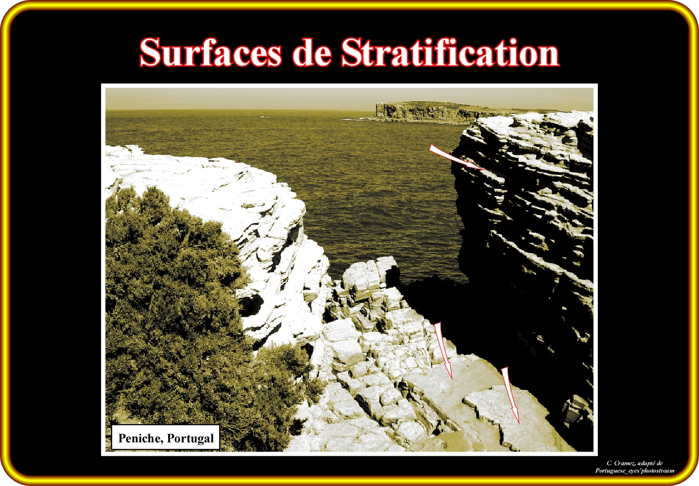 Comme illustré dans cette photo, les couches sédimentaires sont limitées supérieur et inférieurement par des surfaces ou plans de stratification, lesquelles, en générale, sont les éléments plus faciès à identifier dans un affleurement. Elles sont utilisées pour subdiviser les roches en couches et pour déterminer l'ordre et le temps relatif d'accumulation des sédiments que les forment. D'autre coté, les caractéristiques des surfaces ou plans de stratification, soient elles, plus au moins, érodées, cimentées, perforées, bioturbées, sont utilisées dans l'interprétation des roches sédimentaires. Certains géoscientistes, en utilisant de sédiments fluviaux, considèrent qu'on peut considérer quatre grand types de surfaces de stratification : (i) Concordant, autrement dit, sans érosion significative (stratification normale) ; (ii) Non-concordant, mais sans érosion significative ; (iii) Concordant avec érosion et (iv) Non-concordant avec érosion. L'origine des plans de stratification continue a être énigmatique. Certains géoscientistes pensent, que beaucoup de plans de stratification sont, probablement, formés par l'érosion de sédiments non ou peu consolidés sur la surface de dépôt. Le poids des sédiments, immédiatement sous la surface, provoque que les sédiments perdent de l'eau et commence à se compacter, ce que les rendent plus cohésifs. Se la surface de sédiments est soumise à un agent érosif (vagues de tempête, courants de marée, courants fluviaux, écoulement turbiditique, etc.) la surface de stratification érode une part des sédiments, tronquant les moins cohésifs et exhumant ainsi les sédiments inférieurs plus consistants. Quand la déposition reprend c'est sur la surface plus ferme que les nouveaux sédiments se vont déposer. Ainsi, on peut dire, que la différence de densité entre les sédiments non-compactés (avec beaucoup d'eau) et les sédiments un peu compactés (avec moins d'eau) peut créer un plan de stratification. Si le dépôt prend du temps à reprendre, le plan de stratification est, en général, perforé par des glossifungites (ichnofaciès, qui représente un ensemble de terriers.