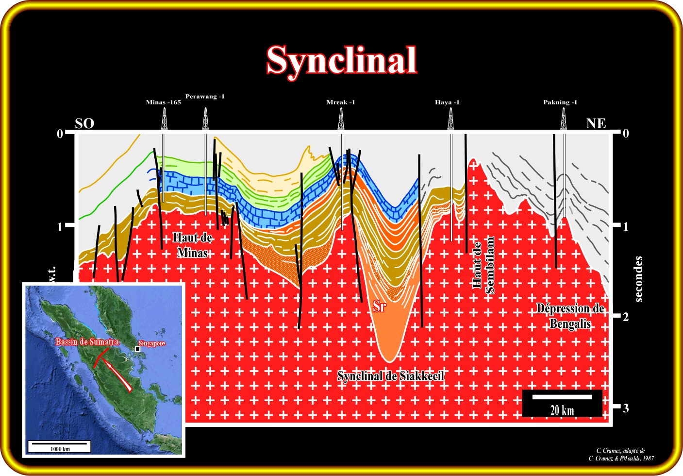 Dans cette tentative d'interprétation géologique d'une ligne sismique composite do nord de l'île de Sumatra (Indonésie), il est évident, que les sédiments ont été raccourcis par un régime tectonique compressif. Ce régime était caractérisé par un ellipsoïde des contraintes effectives (pression géostatique plus pression des pores plus le vecteur tectonique) oblong, ce que veut dire que l'axe σ_1 (axe principal) était horizontal et que les sédiments ont été raccourcis. Cependant, le raccourcissement s'est fait, principalement par des plis cylindriques (anticlinaux et synclinaux) et failles inverses. Ceci signifie que l'axe σ_3 (axe le plus petit de ellipsoïde des contraintes effectives) était vertical. La direction axiale des anticlinaux et synclinaux, ainsi que, la plupart, de la direction des plans des failles inverses était perpendiculaire à la direction du σ_1. Notons qu'il ne peut pas avoir formation de failles normales (synchrones de la compression) en association avec les anticlinaux ou synclinaux, en particulier, près de l'apex des structures. S'il y a des failles normales, elles sont soit plus récentes soit plus anciennes que le raccourcissement, mas pas contemporaines. Quand elles sont plus anciennes, en général, elle sont réactivées (fonction de l'angle entre la direction de la faille et la direction de σ_1) comme failles inverses pendant le raccourcissement, bien que en certains cas elles puissent maintenir, localement, une géométrie normale apparente (quand l'inversion des blocs faillés n'est pas totale). Quand les failles normales sont plus récentes, elles ont une géométrie typique des failles d'allongement. D'autre coté, comme on peut le constater, la plupart des failles visibles dans cette tentative d'interprétation sont les anciennes failles normales créées durant la faille de rifting (extension = allongement) du bassin d'arrière-arc qui ont été réactivées pendant le raccourcissement. De cette manière, la direction axiale des anticlinaux et synclinaux peut, localement, être légèrement différente de la direction de σ_1.