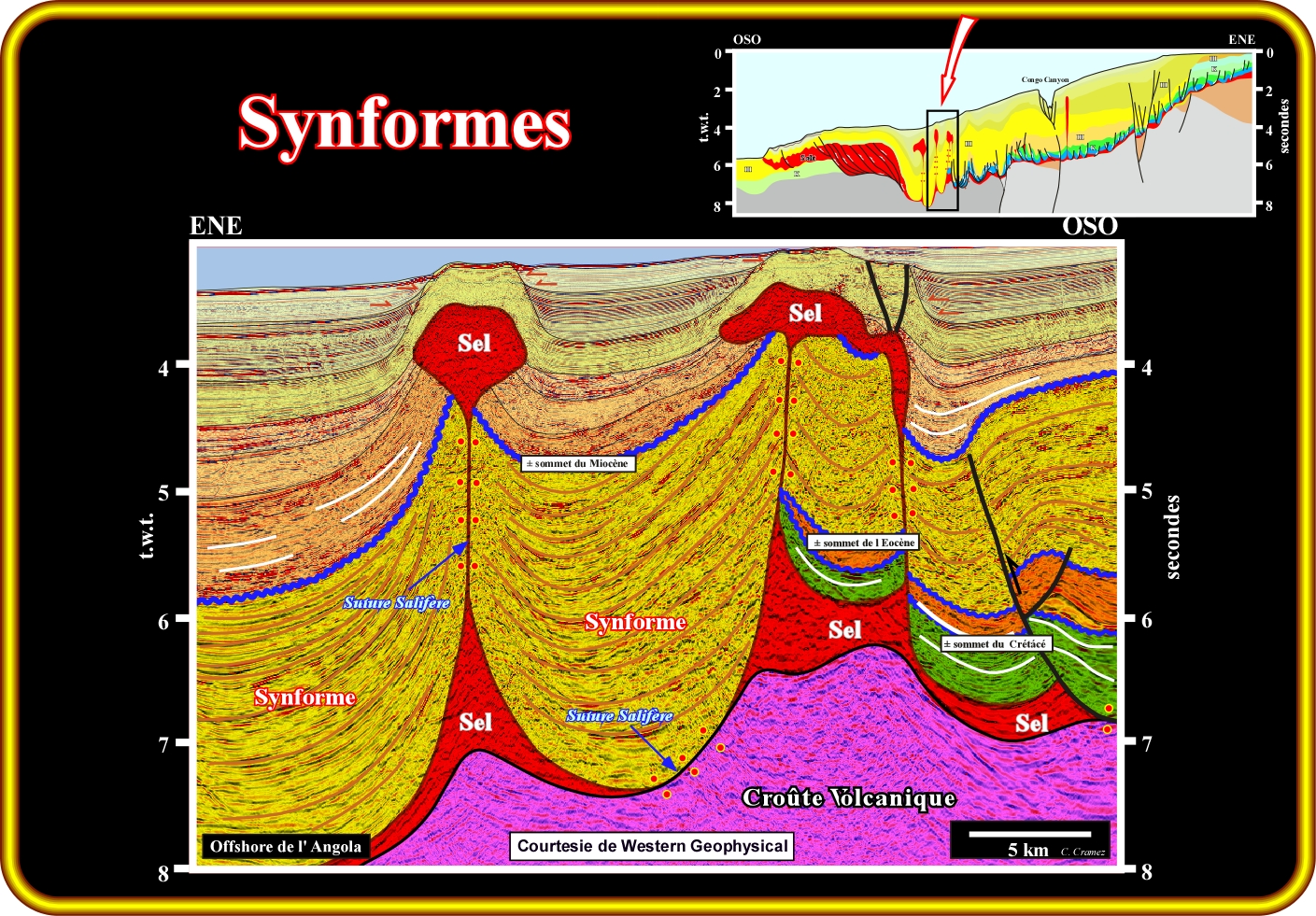 Dans cette tentative d'interprétation géologique d'une ligne sismique de l'offshore Nord de l'Angola, les synformes sont associés avec l'halocinèse (tectonique salifère sans vecteur tectonique). Les synformes se forment au fur et à mesure que le sel s'est écoulé latéral et verticalement. En fait, quand le sel s'écoule, d'écoulement crée un vide, le quel est remplit par les sédiments déjà déposés ou synchrones de l'écoulement. Dans la réalité, comme disent beaucoup de géoscientistes, la nature a horreur du vide. Le remplissage de l'espace vide se fait par allongement des sédiments sus-jacents, le quel ne peut se faire que par des failles normales. La plupart des fois, comme c'est le cas dans cette tentative d'interprétation, les failles normales ne sont pas visibles parce que ses déplacements sont très petits et inférieurs à la résolution sismique. Cependant, les failles normales sont, parfaitement, visibles dans les diagraphies électrique d'inclinaison (HDT) et surtout dans les carottes de forage. Dans cet exemple, la géométrie des synformes a été, plus tard, légèrement comprimée, une fois que pendant le Pliocène, les sédiments ont été raccourcis par un régime tectonique compressif (pression associé aux dorsales océaniques), comme les biseaux d'aggradation, dans la partie supérieur (au-dessus des dômes salifères), le suggèrent. Un tel régime tectonique a contribué à la formation des sutures salifères verticales qui séparent le sel autochtone de allochtone, bien que le mécanisme principal soit la différence de densité entre le sel et les sédiments. Les sédiments se compactent au fur et à mesure qu'il s'enfouissent, ce qui augmente leur densité. La densité du sel est constante, i.e., 2.15 - 2.17 fonction de la teneur en magnésium) en profondeur. Un dôme salifère avec des parois verticales est une impossibilité physique. Il y a un horizon d'inversion, au-dessus du quel le sel est plus dense que les sédiments. Le sel exerce une pression qui n'est pas compensée par la pression des sédiments. En-dessous du point d'inversion, au contraire, la pression que les sédiments exercent contre le sel n'est pas compensée par la pression que le sel exerce contre les sédiments et c'est pour cela que le sel se déconnecte de la roche mère salifère.