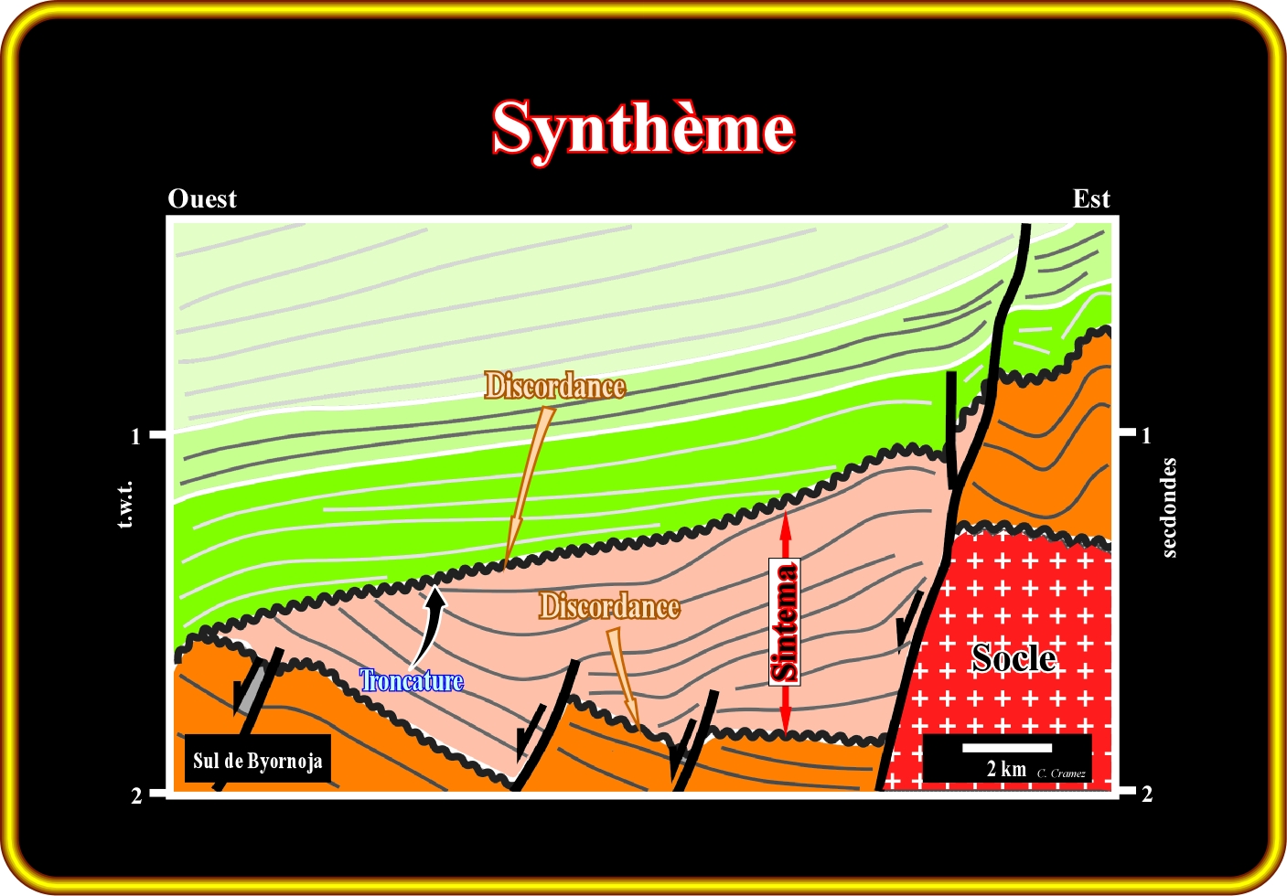 Contrairement à un cycle-séquence qui se peut se mettre en évidence au-delà du rebord du bassin, dans les parties plus profondes, un intervalle stratigraphique discordant ou synthème, en général, peut uniquement se reconnaître sur le talus continental supérieur et en amont du rebord du bassin. En fait, l'érosion, induite par les chutes relatives du niveau de la mer est, uniquement, matérialisée par les canyons sous-marins, biseaux d'aggradation et de troncature, dans le talus continental, et par le remplissage des vallées incisées (ou encaissées) sur la plate-forme continentale. Comme les unités stratigraphiques limitées par discordances, les synthèmes plus fréquents, probablement, sont limités par des discordances régionales et inter-régionales et pour cela ils ont une épaisseur importante (comparable à celle des sous-cycles stratigraphiques d’empiétement continental). Ceci veut dire, que le terme synthème est recommande pour telles unités. Ainsi, il est très utile dans les bassins cratoniques, où la colonne stratigraphique est fondamentalement constituée par des intervalles déposés sous une tranche d'eau, relativement, peu épaisse (en amont du rebord du bassin). Le terme interthème a été proposé, par certains géoscientistes, pour désigner des petites unités stratigraphiques limitées par des discordances plus locales, avec une épaisseur et intervalle de temps équivalentes aux formations et étages géologiques. Les préfixes "sous" et "super" peuvent, éventuellement, être utilisés pour les hiérarchies supérieurs. Dans cette tentative d'interprétation géologique d'une ligne sismique de l'offshore du sud de l'île aux Ourses, le bassin de type-rifte, entre le substratum et la marge divergente, est limité par deux discordances (la discordance supérieure est, nettement, angulaire, ce qui veut dire, qu'elle a été renforcée par la tectonique et, par conséquent, on peut dire, qu'elle forme un synthème. Notons que, comme la plupart des sédiments qui forment les bassins de type-rift sont non-marins, la reconnaissance des discordances internes permet, par fois, de subdiviser le synthème en sous-synthèmes.
