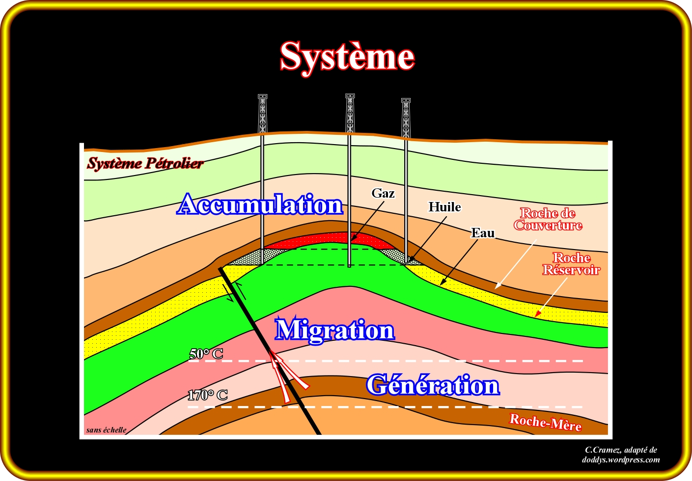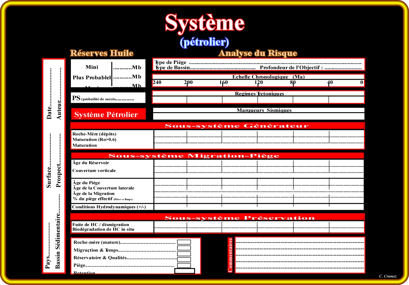 Le terme système vient du grec et signifie combiner, ajuster ou former un ensemble. En fait, tout système, qu'il soit géologique, pétrolier, biologique, etc., a l'objectif, général, a être atteint. Un système est un ensemble d'organes fonctionnels, composants, entités, parties ou éléments et leurs relations ente eux. L'intégration entre ces composants peut se réaliser par flux d'informations, flux de matière, flux d'énergie, etc. La bonne intégration des composants d'un système est la synergie, qui détermine que les informations qui ont eu lieu en une des parts influencera toutes les autres. La haute synergie d'un système fait qu'il soit possible qu'il accomplisse sa finalité et atteigne son objectif de manière efficiente. N'oublions pas qu'un système est plus que la simple somme de ses parts. Pour cela, la méthode cartésienne (étude individuelle des parts pour comprendre le tout) ne fonctionne pas. Dans cette figure est illustré un des divers tableaux de l'étude d'un système pétrolier (relation génétique entre une roche-mère et une accumulation d'huile). Comme on peut le constater un système pétrolier est constitué par trois sous-systèmes : (i) Générateur ; (ii) Migration-Piège et (iii) Préservation, dans lesquels différents paramètres pétrolier doivent être considérés : a) Roche-mère ; b) Roche-réservoir ; c) Roche de couverture (latérale et verticale) ; d) Maturation (de la matière organique) ; e) Migration ; f) Piège et g) Préservation, etc. C'est l'interaction entre tous ces paramètres qui peut créer un système pétrolier, qu'il soit connu (!), hypothétique (.) ou spéculatif (?). Il ne faut confondre système qui, comme dit auparavant, est un tout, formé pour plusieurs parts interconnectées, avec théorie. Une théorie est un ensemble, plus au moins, cohérent d'hypothèses (intuition, pari ou conjecture qui peut être réfuté) testées par évidence et raisonnement qui ont un grand pouvoir explicatif, ce qui veut dire, qu'une théorie est un ensemble d'hypothèses interconnectées qui sont basées : (A) En évidence ou observations ; (B) E raisonnement ou logique et (C) Cohérentes et internement consistantes.