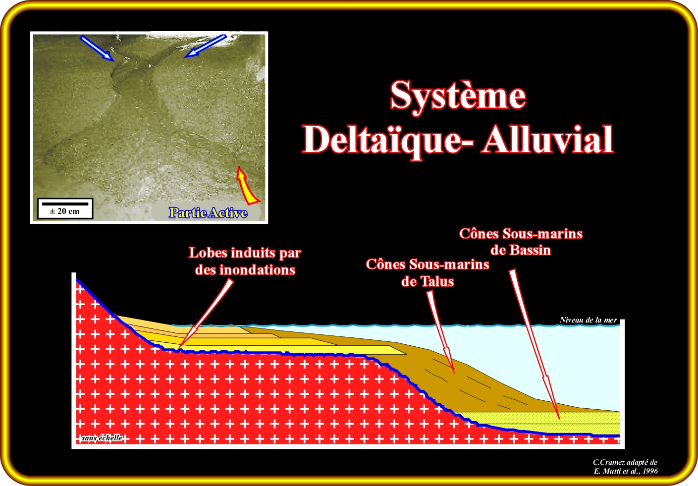 En général, les systèmes deltaïque-alluviaux progradent à partir d'un rupture d'inclinaison importante d'un ligne chron stratigraphique, comme la base ou les contreforts d'une montagne, comme illustré dans ce modèle géologique proposé par E. Mutti. Dans la simulation illustrée dans la partie supérieure gauche de cette figure, les petits lobes de sédiments formés, sous une tranche d'eau très faible, dans les marges d'un cône sédimentaire important, ils se comportent comme un delta digité et simulent un système deltaïque-alluvial. Dans le modèle de Mutti, les lobes associés avec les inondation qui normalement se différencient facilement des cônes sous-marins de talus peuvent, en certains cas, dépasser largement le rebord du bassin. En des telles conditions, la différentiation entre les lobes deltaïques et cônes sous-marins, quand possible, est très subtil. Mutti admet que ni toujours le dépôt de cônes sous-marins, qu'il soit de bassin ou talus, se fait dans des conditions géologiques de bas niveau (niveau de la mer plus bas que le rebord du bassin) en association avec un chute relative du niveau de la mer significative (hypothèse de P. Vail). En fait, pendant les inondations (crues), la charge de s cours d'eau est tellement importante que quand les fleuves entrent dans la mer, ils peuvent induire des courants de turbidité qui transportent, vers les parties profondes des bassins, les sédiments transportés par les crues et les déposer comme des systèmes turbiditiques. De la même façon, quand en conditions de haut niveau de la mer, la ligne de baie (la rupture d'inclinaison la plus en amont d'une ligne chronostratigraphique, qui sépare les dépôts fluviaux des côtiers) est proche du rebord continental (ne pas confondre avec le rebord du bassin, bien qu'ils puissent, en certaines condition, coïncider), il est possible qu'un système deltaïque-alluvial puisse entrer directement dans la mer, en eau profonde, et créer ce que beaucoup de géoscientistes appellent delta alluvial ou delta type-Gilbert.