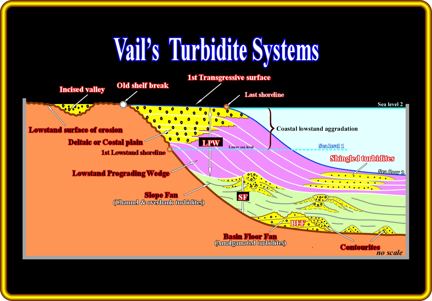 In a deep-water setting, that is to say, when the limit between the shelf break, or the depositional coastal break, and the continental slope is well marked, Vail's turbidite model can be illustrated as depicted on the above sketch. In fact, following a significant relative sea level fall (regional or global), the sea level falls below the shelf break and the continental platform (shelf) is exhumed. Therefore, the basin has no more platform (shelf). The depositional coastal break (roughly the shoreline) is displaced seaward of the old shelf break, creating regional, or global, lowstand geological conditions. Such a displacement disrupts the provisional equilibrium profile of the rivers, which are obliged to cut into the old sediments forming incised valleys in order to establish new provisional equilibrium profiles. Such erosion, created by a significant relative sea level fall, substantially increases the terrigeneous influx. The sediments are discharged on the upper part of the continental slope (the basin has no shelf) and trigger turbidity currents which transport the sediments downward to the deeper parts of the basin, where they are deposited as basin floor (BFF) or slope fans (SF). As the relative sea level starts rising, a lowstand prograding wedge (LPW) fossilizes the turbidite deposits. However, as the lowstand prograding wedge is deposited, instabilities on the upper slope or catastrophic flush floods, can create significant slumps of sandprone material, which will be deposed at the toe of the lowstand progradations forming what geoscientist call shingled turbidites.