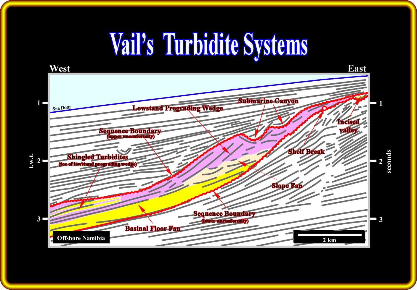 Admittedly, the tentative geological interpretations of the seismic lines of Namibia offshore, using the Vail's turbidite model (an a priori hypothesis), are more difficult to refute than the tentative geological interpretations grounded on Mutti's turbidite models. In Vail's model, eustasy and relative sea level falls are the major geological events that trigger turbidity currents and the associated depositional systems. Actually, as illustrated on this geological tentative interpretation, two consecutive relative sea level falls created two erosional surfaces, i.e., two unconformities (in red). These erosional surfaces are underlined not only by reflection terminations but also by incised valleys located in the uppermost part of the continental slope and in shelf. At each relative sea level fall, the sea level dropped below the shelf break, obliging the rivers to incise their beds to reach new provisional equilibrium profiles. Between two relative sea levels falls, that is to say, between two consecutive unconformities, as depicted, a 3rd order eustatic cycle (time duration between 0.5 My and 3-5 My) took place inducing a stratigraphic sequence-cycle. However, in this particular example, the sequence-cycle is incomplete. In fact, just the lowstand systems tract was deposited. The transgressive and highstand systems tracts are absent. The three members composing the lowstand systems tract are easily recognized by the geometry and reflection terminations. From the bottom to top, one can recognize : (i) Basin floor fan ; (ii) Slope fan and (iii) Lowstand Prograding Wedge with its associated shingled turbidites. Conversely, the absence of obvious slope failures and landslides coupled with a significant progradation (seaward displacement) of the shelf break and associated shelfal deposits apparently refutes the applicability of highstand Mutti's turbidite model in this area.