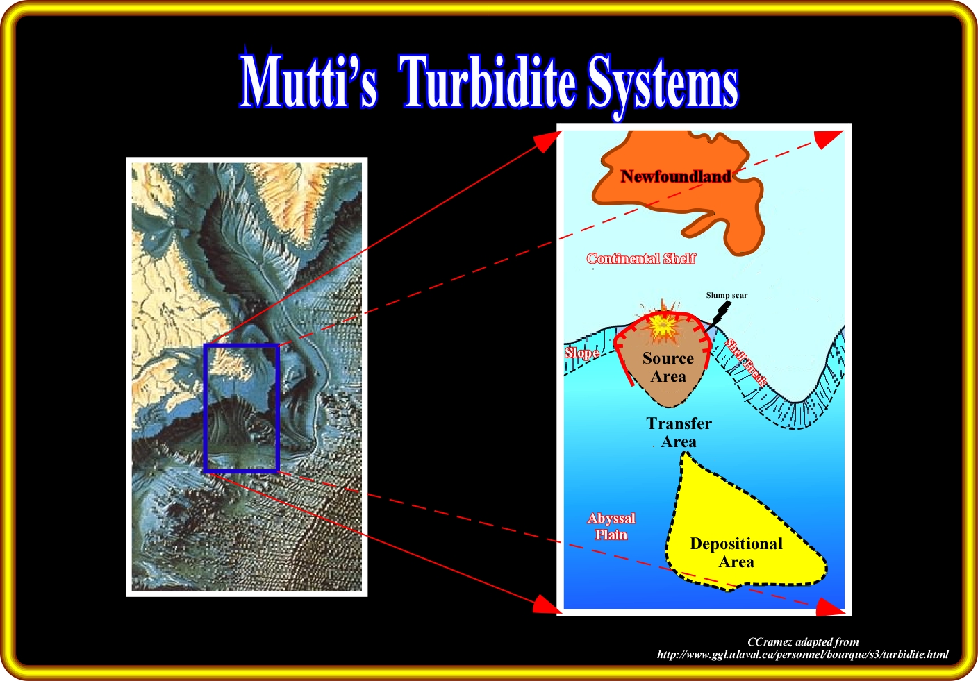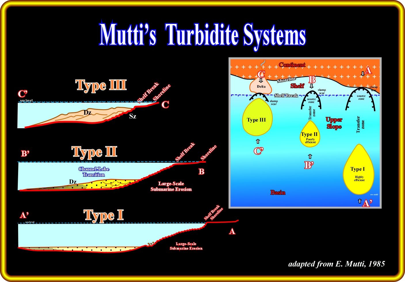 In Mutti's turbidite model, eustasy and relative sea level changes play an important role on turbidite deposition, but they are not essential for the development of the turbidite depositional systems. As pictured above, in Mutti considers three type of turbidite systems, mainly, function of the amount of material transported by the turbidite currents and the position of the sea level (highstand or lowstand). In type II (B-B') and type III (C-C'), turbidite deposition takes place in highstand geological situation, that is to say, when sea level cover the continental platform (shelf), which, in Vail's model is impossible. In fact, as said previously, in Vail's turbidite model, will will be described later, in detail, turbidite deposition requires a lowstand geological setting created by a relative sea level fall (combination of the eustasy with subsidence or uplift), in which eustasy is predominant. The Mutti's type I turbidite depositional systems developed in a geological context of lowstand, since, as illustrate above, the basin has no shelf. In fact, in this case, the shoreline and shelf break are, more or less, coincident. In Mutti's type I and II turbidite depositional systems, the turbidity currents are mainly triggered by significant slope failures and slumps, located near the limit between the upper slope and shelf. On the other hand, a paramount progradation of the shelf break, associated often with catastrophic flush floods, is often the onset of turbidity currents in Mutti's type III turbidite systems. Subsequently, a source area (seaward of a slump scar, for instance) and a transfer zone are often recognized updip of major turbidite depositional system.
