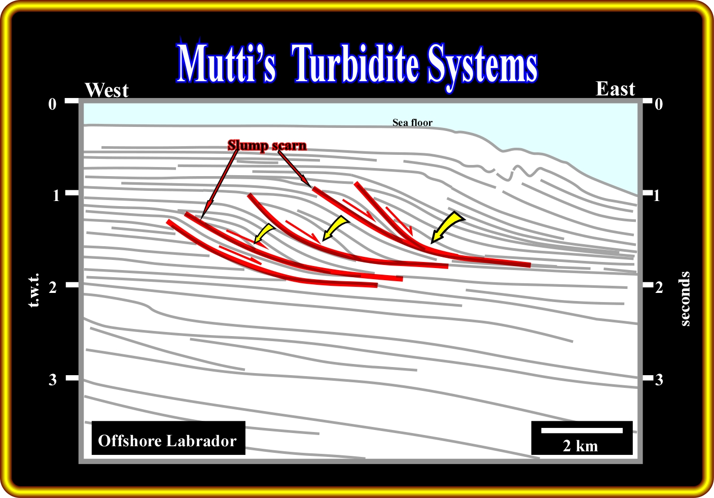 This plate illustrates an ingenious geological tentative interpretation of a seismic line from Labrador offshore (Canada), in which just the seismic reflectors and seismic surfaces (reflection terminations) are picked. However, sedimentary anomaly at the base of the progradation (continental slope) are easily reckoned. Theoretically, different tentative solutions can be put forward to explain the depicted geometry of seismic reflectors, particularly seaward of the successive shelf breaks. Such tentative solutions can be based either on Vail's or Mutti's models. However, those based on Vail's turbidite model do not resist to a mild critical test. In fact, all along the coastal plain (subhorizontal reflectors continentward of the s shelf breaks), there is no evidence of incised valleys and, in the upper continental slope, there is no evidence of submarine canyons. In other words, between 0.9 and 1.9 seconds (t.w.t.), there is no evidence of a significant relative sea level falls. Therefore, the hypothesis of a continuous significant regression (forestepping) with catastrophic floods and slope-shelf failures seems more likely. On the other hand, at five different time-periods, the continental slope is obviously underlined by strong seismic reflectors (under the red seismic surfaces), which look like slump scars suggesting gravity slumps triggered, probably, by catastrophic flush floods. In other words, taking into account the absence of evident regional erosional surfaces and the likelihood of large slumpings, the chosen tentative solution must be grounded, mainly, in Mutti's turbidite model. Nevertheless, this ingenuous geological tentative interpretation do not refute the probability of presence, along the continental slope, of rectilinear submarine valleys induced by upwelling submarine currents, which can be easily recognized on strike (transversal) seismic lines (see next plate).