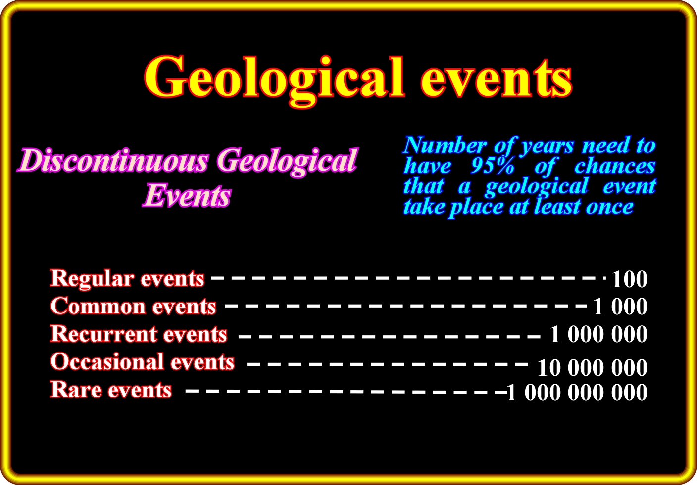 According to its frequency, Gretener (1967) classified a geological event in : (i) Regular, which takes place, more or less, every 100 year ; (ii) Common, which occurs, more or less, every 1000 years ; (iii) Recurrent, which happens, more or less, every 1 000 000 years ; (iv) Occasional, which comes about, more or less, every 10 000 000 years and (v) Rare, when it occurs, more or less, every 1 000 000 000 years.