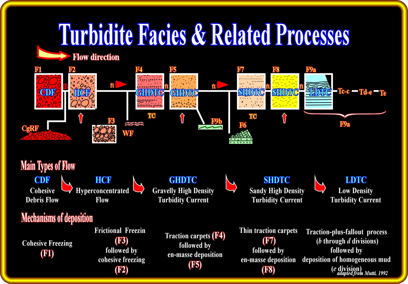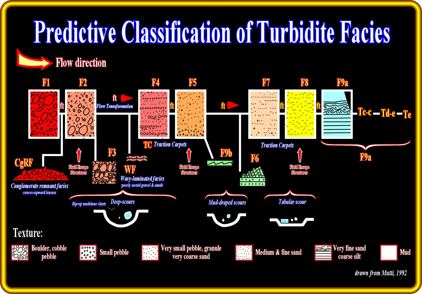 Facies tracts can only be significantly reconstructed within a framework for predictive facies classification scheme that relates facies and processes, i.e., through second or genetic level of facies analysis. Such a framework, proposed by Mutti (1977, 1992), is illustrated below and covers a very broad spectrum of facies from cohesive debris flow deposits (F1), with boulder-, cobble-, and pebble-sized clasts, to graded mudstones (Te of F9a).