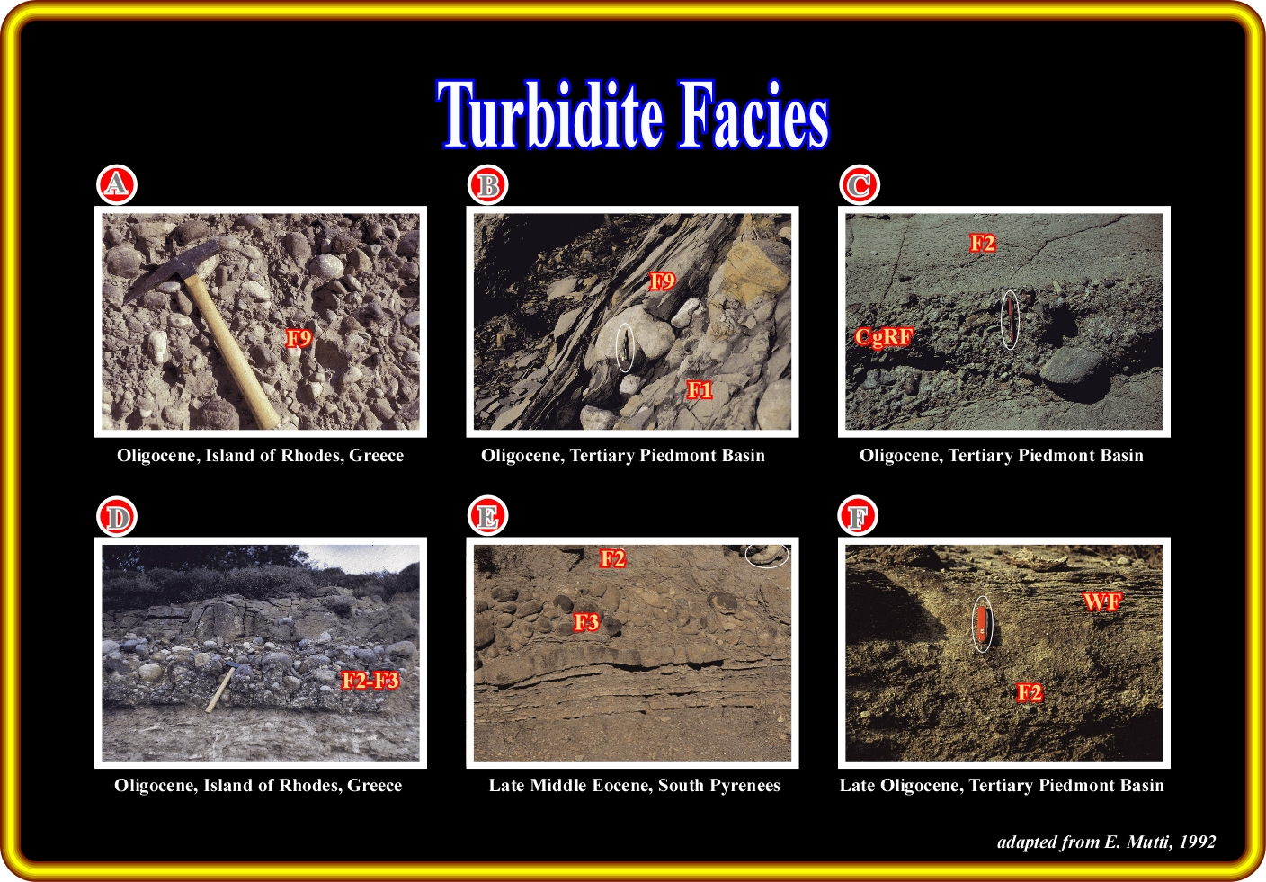 - F9 deposits are made up of thoroughly current-laminated divisions of very fine sand and coarse siltstone which are capped by a massive mudstone division, These sediments, which are commonly referred to in most literature as “base-missing” Bouma sequences (Tb-e, Tc-e, Td-e and Te sequences), constitute the volumetrically most important component of many ancient turbidite basin-fills. F9 strata can be simply defined as turbidite beds, which have been deposited by traction-plus-fallout processes, associated with the various stages of sedimentation of waning low-density turbidity currents.